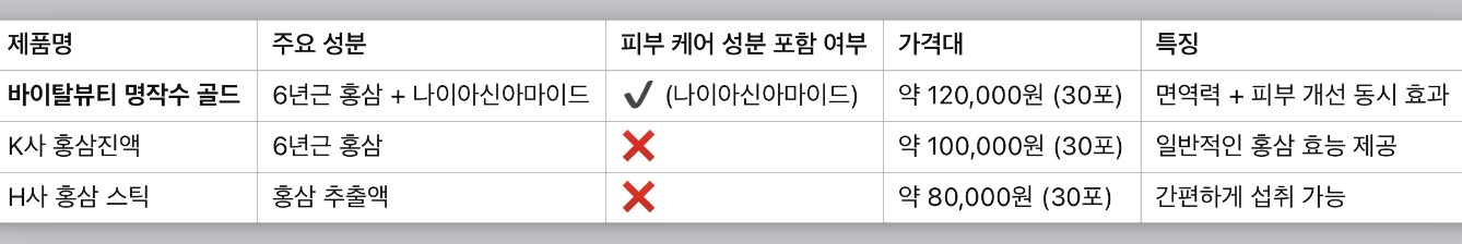 대부분의 홍삼 진액이 면역력 강화나 피로 회복에 초점을 맞춘 반면, 바이탈뷰티 명작수 골드는 피부 개선 성분까지 포함된 점이 차별화됩니다. 특히 나이아신아마이드의 추가는 경쟁 제품에서는 찾아보기 어려운 포인트입니다.